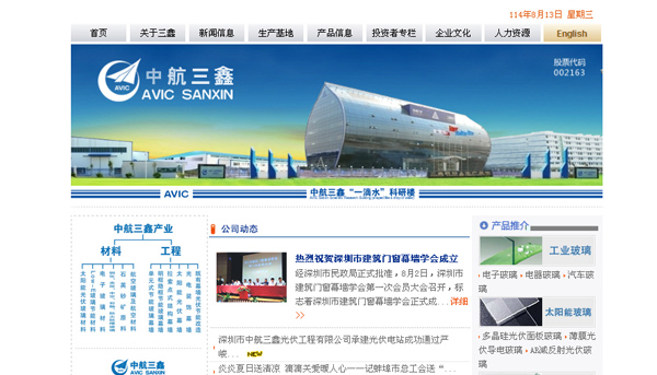 中航三鑫股份有限公司,前身為“深圳市三鑫特種玻璃技術(shù)股份有限公司”,是中國航空工業(yè)集團(tuán)公司旗下企業(yè)。公司創(chuàng)辦于1995年6月,經(jīng)過十幾年的發(fā)展,于2007年8月在深圳證交所A股上